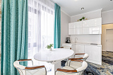 Площадь квартиры составляет 50 метров. Пространство поделено на просторную непроходную спальную комнату, кухню, совмещенную с гостиной, два балкона с прекрасным видом! Такое решение делает объект на самом деле отличным вариантом для жизни и отдыха семей, которые ценят свободу личного пространства.