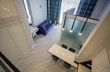 Помимо удачной локации данная квартира обладает рядом преимуществ в отношении ее планировки. Помещение спланировано в двух уровнях. На первом уровне располагается хозяйская спальня, просторная кухня-гостиная и санузел. На втором этаже организована дополнительная детская спальня с двумя отдельными кроватями. Детская комната сконструирована таким образом, чтобы обеспечить детям безопасность, полностью исключая возможность случайного падения.