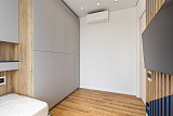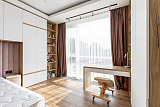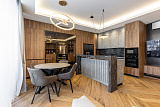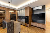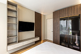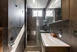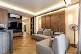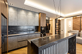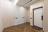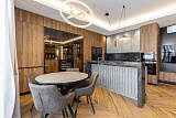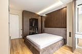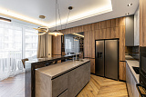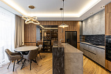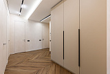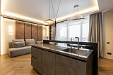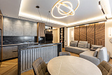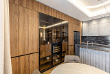 Площадь квартиры составляет 147 м2, из них: три спальных комнаты, большой зал, объединенный с кухней, два санузла, гардеробная, балконы. Грамотное зонирование и продуманная расстановка мебели. Квартира полностью укомплектована мебелью и техникой именитых брендов. В основе оформления пространства лежит элегантный и современный классический стиль. Отделка выполнена с использованием дорогостоящих и высококачественных материалов. Установлена премиальная мебель, бытовая техника от Miele, а также все необходимое климатическое оборудование.
