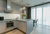 Квартира полностью подготовлена для проживания и укомплектована всем нужным: постельным бельем, столовыми приборами, современной техникой, включая посудомоечную машину. В спальнях установлены две большие двуспальные кровати. В ванной комнате предусмотрена душевая кабина и ванна. Приятное ощущение тепла создается системой подогрева полов во всех комнатах.