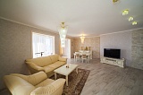 - гостиной комнаты, в которой располагаются диваны из кожи светлых тонов, обеденный стол из дуба со стульями, на стене есть большой современный плазменный телевизор;