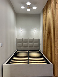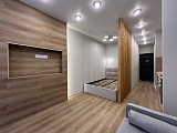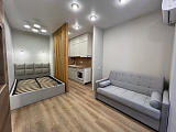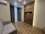В квартире выделена полноценная зона для сна с большой двуспальной кроватью, небольшая, но функциональная кухня, гостиная. Санузел в квартире совмещенный.