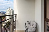 Площадь представленной квартиры – 55 м2. Пространство распланировано на просторную спальню, зал, кухню, гардеробную, прихожую и санузел. Есть открытый балкон с чудесным видом на город, море, зелень. Тут можно оборудовать зону для отдыха на свежем воздухе. Большое внимание авторы проекта уделили вопросу организации систем хранения, благодаря чему интерьер лишен визуального шума.
