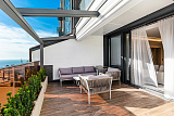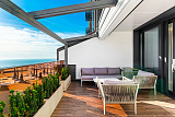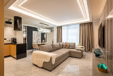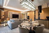 Большая гостиная комната сочетается со столовой и кухонной зонами, что создает уютное пространство для общения и отдыха. Из гостиной выход на роскошную террасу, с которой открывается потрясающий вид на территорию комплекса и море. Это создает атмосферу романтики и позволяет наслаждаться утренним солнцем или вечерними закатами в кругу близких людей.