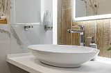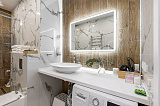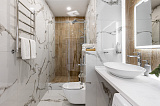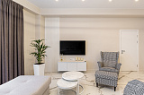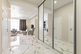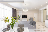 Внутренняя отделка – дорогостоящий ремонт, покоряющий эстетикой. В оформлении здесь продумана каждая деталь: от материалов отделки до предметов декора и домашнего текстиля. Основа оформления – классика, дополненная мотивами средиземноморской тематики. Светлая палитра красок визуально делает квартиру еще более просторной и наполняет ее совершенно особым уютом.