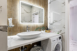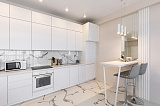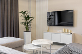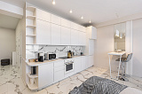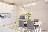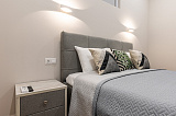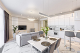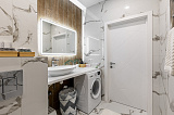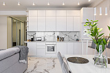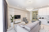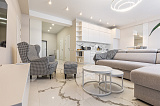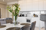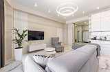 В квартире выделено две большие спальни и просторная кухня-гостиная. В интерьере продумана каждая деталь – от материалов отделки до декора. Подробнее