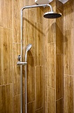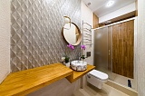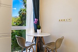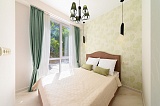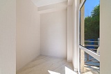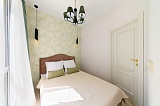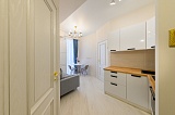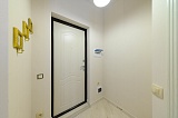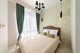 В оформлении интерьера преобладают классические мотивы. Светлая палитра красок визуально раздвигает границы жилого пространства и делает его еще более уютным. Выделена изолированная спальная комната, зона кухни совмещена вместе с гостиной. Есть открытый небольшой балкон с очень хорошим видом на зелень.