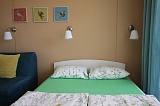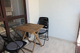 Площадь представленной студии составляет 30 квадратных метров. Здесь выделена полноценная зона для отдыха с большой двуспальной кроватью, небольшая кухня и обеденная зона. Также в квартире есть балкон с очень хорошим видом.