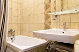 Санузел отделан кафельной плиткой, под раковиной – стиральная машинка.