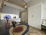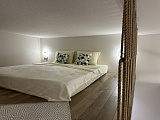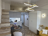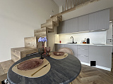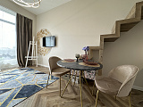 Площадь студии – 34 м2. Грамотное зонирование пространство делает ее по-настоящему комфортной и удобной для проживания. На первом уровне (25 м2) находится кухня с гостиной зоной и санузел. На втором (9 м2) – зона для отдыха и сна. Здесь с комфортом сможет расположиться до 4 человек. Витражное остекление наполняет квартиру еще большим уютом, а также позволяет любоваться прекрасным видом на море и зелень практически из любой точки.