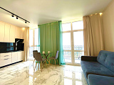 Общая площадь данной квартиры – 35 м2. Ее пространство самым гармоничным образом распланировано на изолированную спальную комнату и гостиную, совмещенную вместе с кухней. Есть открытый балкон, с которого открывается потрясающий вид на морскую акваторию и панораму парка «Дендрарий».
