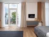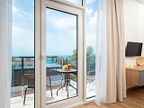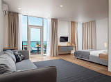 Студийная планировка пространства в апартаментах позволяет в полной мере насладиться атмосферой свободы и уюта. Грамотный подход дизайнеров к вопросу зонирования – большой плюс. В апартаментах выделена полноценная зона для отдыха с большой двуспальной кроватью, кухня-гостиная и совмещенный санузел. Есть открытый балкон с прекрасным видом на морскую акваторию.