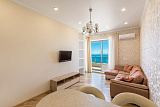 Кухню с гостиной и выходом на террасу, с очень красивым видом на море и весь город Сочи.