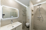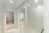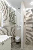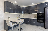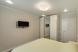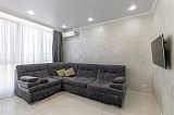 Сама квартира получилась очень светлая и уютная, а самое главное с грамотной планировкой: две полноценные спальные комнаты, кухня/столовая переходящая в гостиную, прихожая и конечно же санузел с душевой. При отделке квартиры использовались дорогие материалы: керамогранит 120*120 (производство Италия), стены отделаны венецианкой, полы в спальнях из пробкового покрытия, в коридоре и кухне/гостиной теплые полы, дорогие межкомнатные двери с внутренними петлями. В ванной комнате установлена сантехника фирм PORCELANOSA, Hansgrohe, стиральная машина с сушкой. В гостиной диван фирмы Moon, кухня выполнена под заказ с интегрированной мойкой. Кровати выполнены под заказ, итальянские матрасы. Встроенные шкафы по периметру коридора.
