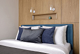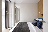 Современное жилье премиум-класса сочетает в себе элегантный дизайн и функциональность. Пространство включает уютную спальню с комфортной двуспальной кроватью и современной климатической системой, создающей идеальную атмосферу для отдыха. Светонепроницаемые шторы позволяют наслаждаться полным уединением и спокойным сном.
