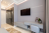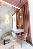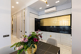Первое, на что обращаешь внимание, попадая сюда впервые – это детально продуманное зонирование пространства и стильный интерьер. Основа оформления – светлая палитра красок, дополненная пастельными оттенками. Живая зелень в декоре придает пентхаусу еще более стильный вид, наполняет его особым очарованием и уютом.