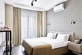 Апартаменты входят в состав престижного комплекса, который находится в нескольких метрах от береговой линии. На первом этаже находится ресторан с летней террасой, есть собственный открытый бассейн с зоной для принятия солнечных ванн. Большое внимание тут уделено вопросу внутреннего сервиса, что делает проживание и отдых еще более комфортными с точки зрения быта.