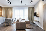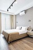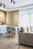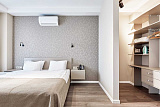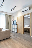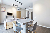 Общая площадь представленного апарта – 56,1 м2. Внутреннее пространство поделено на изолированную спальную комнату, кухню-гостиную, гардеробную и открытую террасу с панорамным видом на набережную и морскую акваторию. Внутри сделан новый ремонт, который не требует и никаких дополнительных финансовых вложений. Тут все уже готово для жизни и отдыха. Комнаты укомплектованы мебелью, техникой. Установлены системы кондиционирования воздуха.