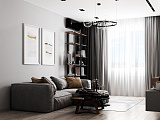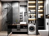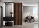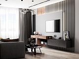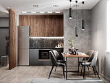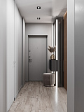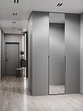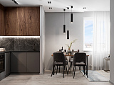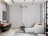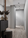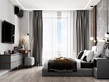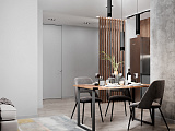 Общая площадь предложения составляет 76,9 м2. Внутреннее пространство поделено на просторную кухню, гостиную и спальню с большой лоджией. Отдельно выделена гардеробная комната, что позволяет избавить интерьер от лишнего визуального шума и хранить здесь все вещи: от предметов одежды до техники.