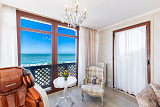 Предлагаем Вашему вниманию уникальное предложение на берегу черного моря - просторная квартира с панорамным видом на море в АК "Резиденция Санторини". Комплекс с закрытой приватной территорией у самого моря с собственным пляжем, расположен в самом центре Сочи на территории санатория Заполярье. Данная квартира очень просторная и грамотно распланирована: 3 полноценные спальные комнаты со своими санузлами, из двух спален можно выйти на большую открытую террасу с панорамным видом на море, шикарное место для релакса, все самые красивые закаты будут ваши! Отдельное внимание заслуживает шикарная гостиная комната с панорамным остеклением и видом на море, выделенная кухня с выходом на открытую террасу с морским видом. Помимо всего в квартире имеется собственная баня с душевой, с отдельным входом с террасы. В квартире выполнен качественный дизайнерский ремонт, установлена дорогая Итальянская мебель.