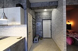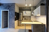 Открывая дверь, Вы попадаете в прихожую комнату. Направо – дверь в санузел. Прямо – просторная кухня с выделенной гостиной зоной. Зона спальни также входит в состав кухонно-гостиной части и отделена от прихожей стенки из гипсокартона. Сразу за кухней – дверь в изолированную детскую комнату. Есть небольшой открытый балкон с очень хорошим и приятным видом на городские пейзажи и на море!