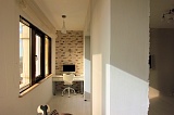 Распланирована квартира на спальню, а также на просторную кухню, совмещенную с гостиной. Гостевую часть от кухонной зоны отделяет барная стойка, которая, в целых экономии пространства, может также выполнять функцию обеденного стола. Лоджия комната переоборудована в небольшой, но функциональный рабочий кабинет.