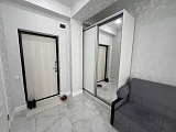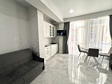 Площадь представленной квартиры – 29 м2. Грамотное зонирование пространства – гарант комфорта для обитателей. В гостиной части установлено 2 больших раскладывающихся дивана, на кухне – гарнитур и обеденный стол. В прихожей – шкаф-купе с зеркалом в пол. Есть открытый балкон, с которого открывается очень приятный вид на город и море.
