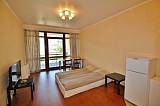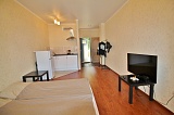 - в огромной комнате располагается большая двуспальная кровать, стол со стульями на две персоны, также есть кухонная зона, которая оснащена прекрасным практичным гарнитуром и современной бытовой техникой известных брендов;
