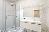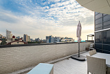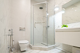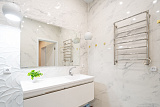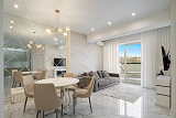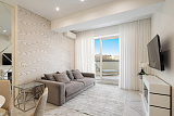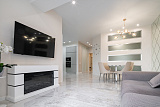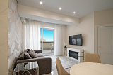 Светлая квартира с дизайнерским ремонтом и грамотной планировкой: две спальные комнаты, одна с выходом на открытую террасу, выделенная кухонная и столовая зона переходящая в гостиную, два раздельных санузла, прихожая с гардеробной и конечно же открытая терраса с шикарным видом на море и город.