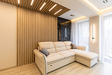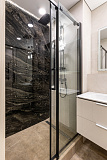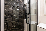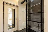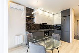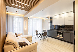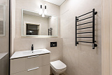 Площадь квартиры – 34 м2. Студийное планировочное решение с детально продуманным зонированием пространства. Выделена полноценная кухня и обособленный гостиный уголок, который также выступает зоной для отдыха. Наличие гардеробной комнаты – это весомый плюс, благодаря которому можно освободить пространство от личных вещей и избавить от визуального шума в перспективе. Также отметим, что квартира оснащена двумя французскими балконами, которые придают пространству дополнительное освещение, и позволяют наслаждаться красивым видом на территорию комплекса, зелень.