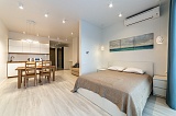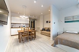 Предлагается к продаже новая дизайнерская студия с террасой в элитном ЖК "Актер". Студия получилась очень светлая и просторная поделенная на три зоны, спальная зона с выходом на открытую террасу (лаунж зону), кухня - столовая, а так же гостиная три в одном, и прихожая зона с гардеробом. Совмещенный санузел с душевой. Апартаменты расположены в отличном комплексе с большой территорией, открытым бассейном, охрана периметра с видеонаблюдением, паркинг придомовой и подземный, детская и спортивные площадки, кафе и ресторан на территории комплекса. До пляжа 5 минут пешком прям по территории комплекса.