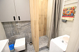 Площадь этой квартиры – 34 м2. Выделена полноценная зона для отдыха с большой двуспальной кроватью, гостиная часть с раскладывающимся диваном и кухня. Санузел – совмещенный.