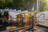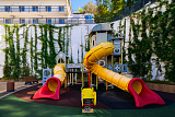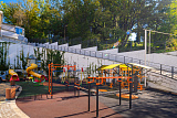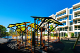 Изюминкой ландшафта резиденции являются 12 величественных пальм «Вашингтония», которые венчают волнообразные зеленые зоны с вечнозелеными цветущими шарообразными кустарниками и травянистыми растениями. Все зелёные зоны резиденции оснащены автополивом. Из каждого жилого блока организован свой выход на дворовой уровень и зону бассейна. Здесь же расположены детская развивающая игровая площадка с горками и качелями. Детская зона размещена на специальном мягком покрытии. Для родителей предусмотрены удобные скамейки. Спортивная площадка с уличными тренажерами и турниками также является знаковым атрибутом резиденции.