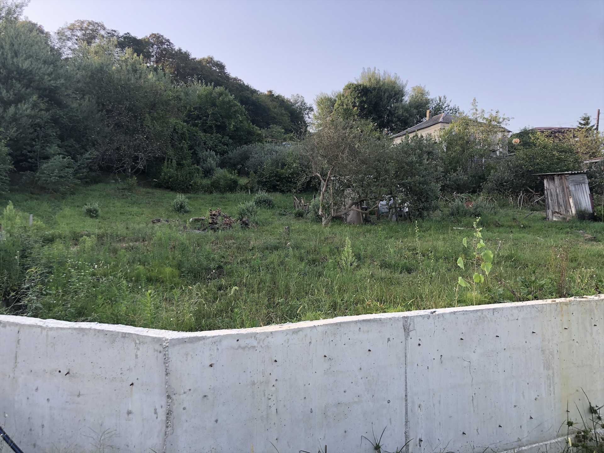 Участок абсолютно ровный, площадь 14 соток, подготовлены и залиты подпорные стены, фундамент под три дома.