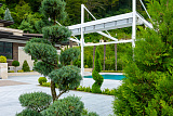 - Вилла создана таким образом, чтобы органично вписываться в окружающий ландшафт. Главный фасад с представительной входной группой выходит к бассейну и на застекленную террасу, обеспечивая прекрасный вид и уединение.