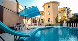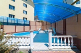 На приусадебном участке находится бассейн с подогревом и красивой подсветкой в темное время суток. Рядом – зона для принятия солнечных ванн. Есть горка для детей, а также мягкие качели.