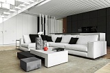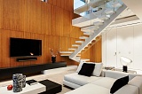 Над оформлением дома поработали профессиональные дизайнеры. Контрастность белого и черного цвета, воздушная лестница, обрамленная стеклянными перилами, отвечают требованиям гармонии и лаконичности.