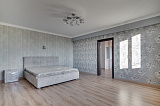 Первое, на что мы бы хотели обратить внимание – это сочетание внушительной площади с продуманной планировкой. Общий метраж дома – 400 м2. Внутри выделено 5 просторных спальных комнат, кухня-гостиная, сауна и подсобные помещения. Все комнаты очень светлые и просторные. Смело можно рассматривать дом для проживания больших семей и не переживать о том, что кто-то из домочадцев будет чувствовать себя неуютно.