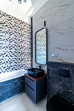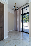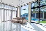 Первый этаж предлагает прекрасную кухню-гостиную с выходом на просторную террасу, где расположен бассейн. Также на этом этаже вы найдете техническое помещение, гардеробную, гостевой санузел, а также уютную жилую комнату с собственным гардеробом и ванной комнатой.