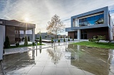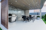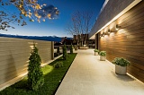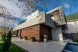 При проведении отделочных фасадных работ использовали натуральный камень, керамогранит, экзотические виды дерева. Остекление выбрано солнцезащитное. Закаленное стекло значительно увеличивает уровень безопасности.