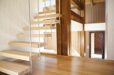 Крыша дома двухскатная, выполнена из кровельного металла. Стены дома из стекла, бетона и дерева.