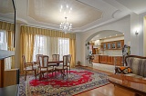 На 1-ом уровне находится просторная прихожая комната, гардеробная, каминный зал, сауна, спортзал, кухня, санузел и прачечная. Второй этаж – парадный вход, спальня хозяев, кухня-столовая и кладовая комната. Третий уровень особняка – три спальных комнаты, зал, кухня и санузел. Внутренняя отделка – авторский ремонт, выполненный по эксклюзивному проекту. Подключены центральные коммуникационные системы.