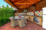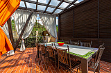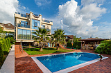 Дом находится в центральной части города, его общая площадь – 500 м2, а площадь земельного участка – 7 соток. Фасады особняка облицованы керамогранитом Travertino, кровля – плитка Klonkers Sire (Италия). Перед домом располагается большой бассейн с зоной, где можно наслаждаться солнечными лучами. Также на участке есть уютная летняя терраса. Установлен стол, выполненный из вулканического камня и итальянская мебель Domiziani.