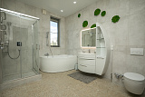 Дом полностью меблирован дорогой европейской мебелью, вся техника — премиального класса. Интерьеры выдержаны в современном стиле, где каждая деталь работает на общее впечатление — легкость, простор, респектабельность.