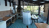 В цокольном этаже дома расположились финская сауна, комната отдыха, с/у. На первом этаже - прихожая, холл, кухня-столовая, гостиная, с/у, котельная. На втором этаже - 3 спальни с гардеробом, ванная, 16-ти метровая терраса. Кроме того есть беседка с барбекю, крытая парковка, бассейн с раздвижной крышей и подогревом воды.