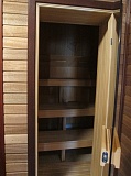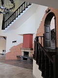 Необычность архитектуры дома подчеркивают высокие потолки в гостиной и обеденной комнатах, а также массивные лестничные пролеты. В доме имеется каминный зал, 3 спальных комнаты, кабинет, гардеробная, 3 с/узла, сауна, просторная крытая терраса.