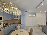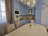 Кухня оборудована фасадами с окраской, фурнитурой Blum и техникой Smeg: от кофемашины до встроенного тостера — всё итальянское, всё настоящее. В спальнях кровати Askona с матрасами премиум-класса, в каждой комнате кондиционер, шторы из испанских тканей с подхватами, люстры от Arti Lampadari, Favourite, Lightstar, Crystal Lux и Newport — как будто интерьер вдохновлён страницами журнала Elle Decor. На первом этаже — функциональные системы хранения, стиральная машина, телевизоры в каждой комнате.