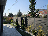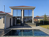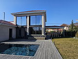 Большой участок 7 соток, где располагается бассейн с подогревом, банный комплекс, зона барбекю и зона парковки по два автомобиля.