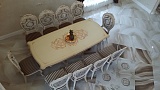 В доме выполнено оригинальное архитектурное решение - второй этаж внутри дома. Первый этаж - огромная столовая, зона кухни, комната отдыха, спальня, гостевой санузел. Второй этаж - хозяйская спальня с гардеробной, огромный санузел, комната отдыха и гардеробная.