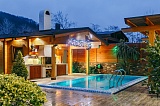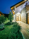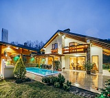 На участке, площадь которого равна 7 соткам, выполнен очень красивый ландшафтный дизайн, который подчеркивает роскошь архитектуры самого здания. Благоустроены зоны для отдыха, есть бассейн, парковочное пространство для автомобилей, летняя кухня с мангалом.